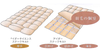 特殊なキルティングテープを使い一つ一つ独立したボックス型の「羽毛の個室」を作りダウンを均一に詰めています。羽毛の偏りが全くありません。